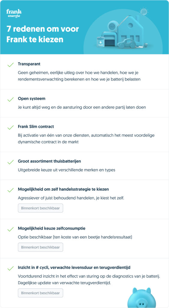 Frank Energie biedt dynamische energiecontracten en een slimme app waarmee je volledig inzicht hebt in je verbruik, kosten én kansen. Combineer dat met onze thuisbatterij en je profiteert maximaal van: