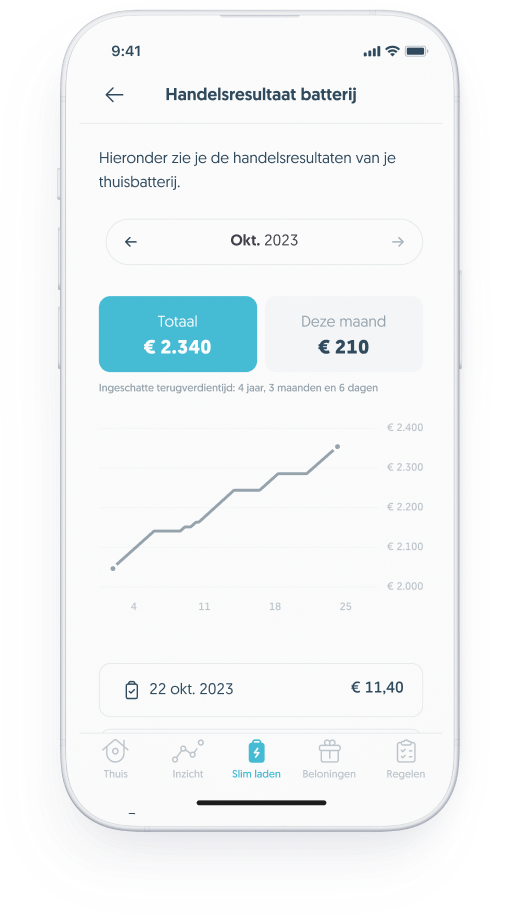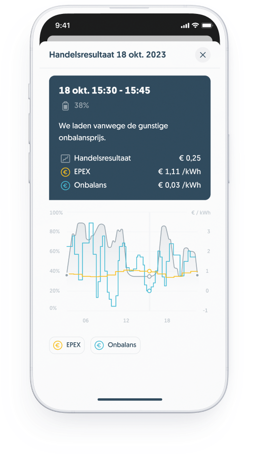 Met slim handelen maak je gebruik van dynamische energietarieven: de stroomprijzen veranderen elk uur. Op momenten dat stroom goedkoop of zelfs negatief geprijsd is, laadt je thuisbatterij automatisch op. Is de stroomprijs hoog? Dan gebruik je jouw opgeslagen energie of verkoop je deze terug aan het net. Dit alles gebeurt volautomatisch, op basis van slimme algoritmes.